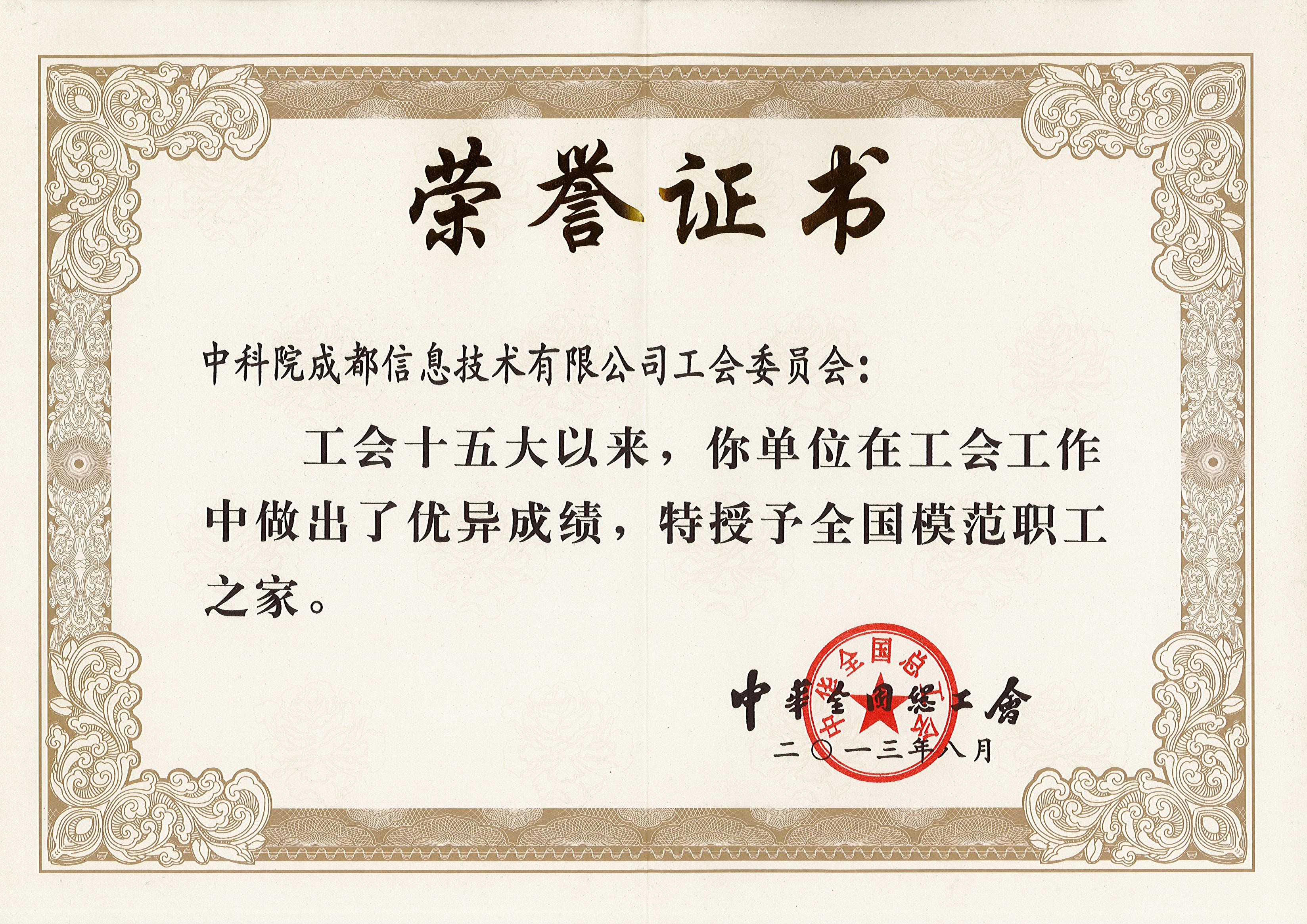 2013年(nian),中(zhong)科(ke)院成(cheng)都信(xin)息技(ji)術(shù)股份有(yǒu)限(xian)公(gōng)司被全國(guo)總工(gong)會授(shou)予“全國(guo)