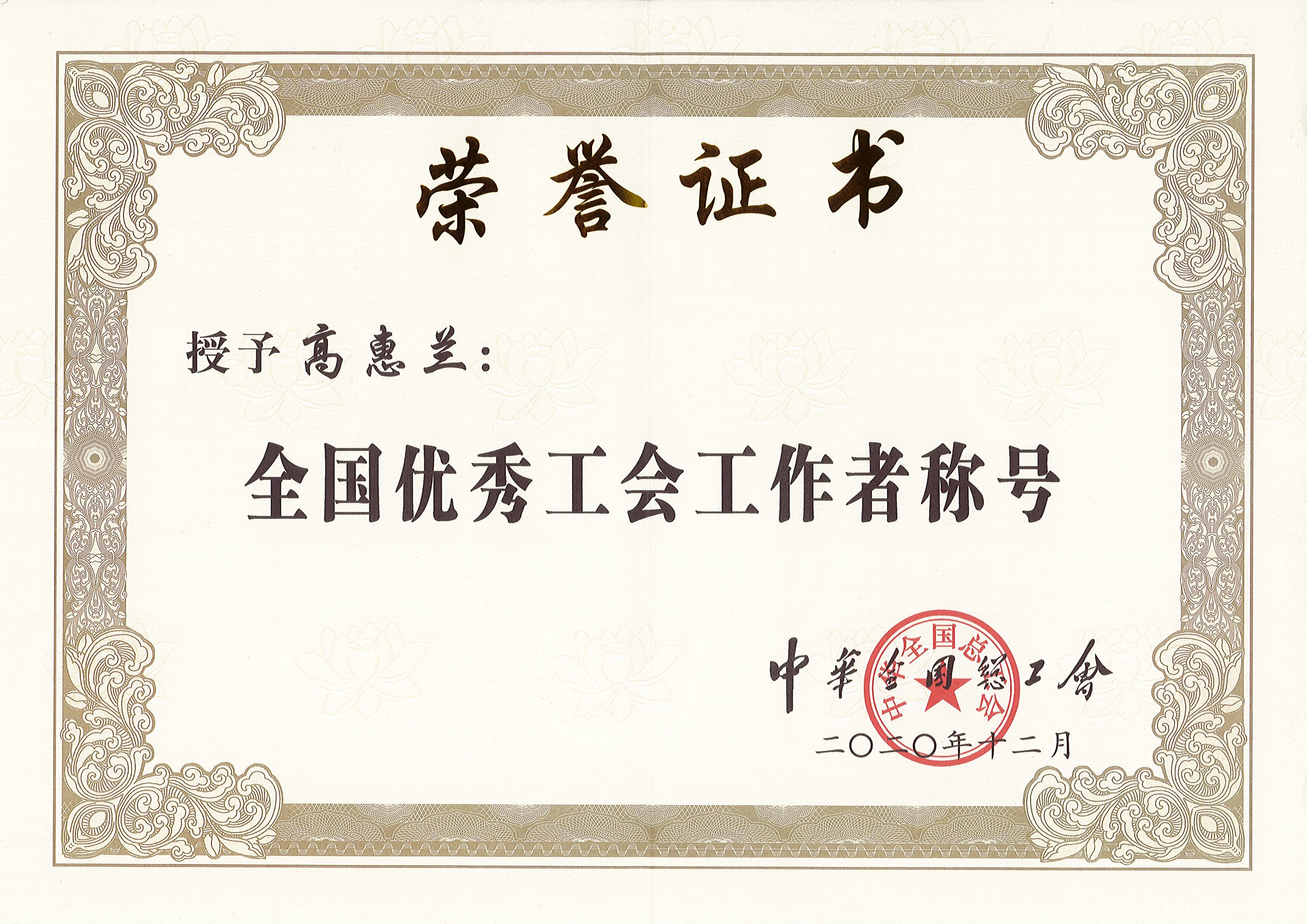 高(gao)惠蘭同志(zhì)榮獲“全國(guo)優(you)秀工(gong)會工(gong)作(zuò)者”榮譽