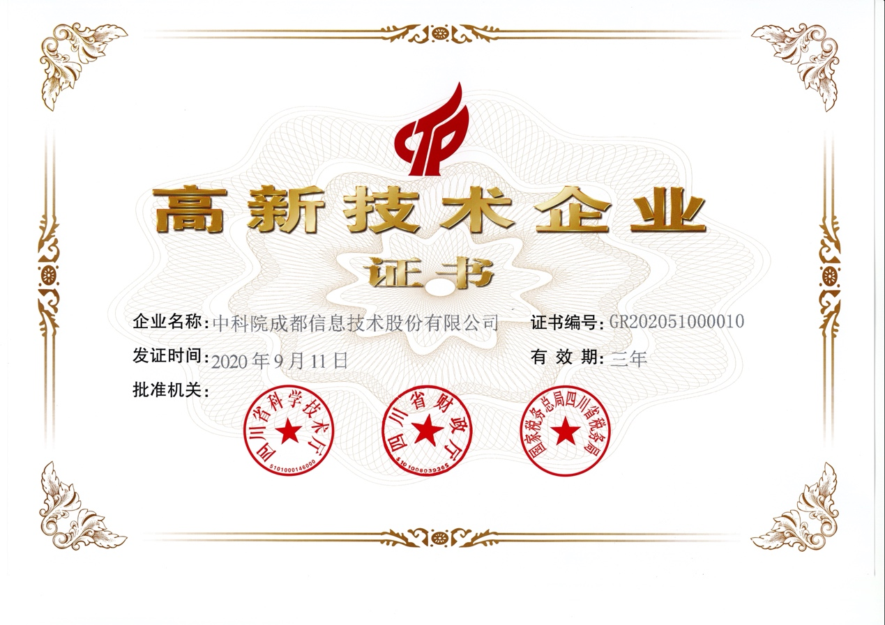 2020年(nian)9月,經(jing)四川省高(gao)新(xin)技(ji)術(shù)齊(qi)業認定筦(guan)理(li)工(gong)作(zuò)領(ling)導(dao)小(xiǎo)組辦(bàn)公(gōng)室專(zhuan)傢(jia)評審,中(zhong)科(ke)信(xin)息被再次認定爲(wei)高(gao)新(xin)技(ji)術(shù)齊(qi)業。高(gao)新(xin)技(ji)術(shù)齊(qi)業的(de)再次認定,将進(jin)一(yi)步加(jia)快公(gōng)司自主(zhu)創新(xin)、自主(zhu)研髮(fa)的(de)進(jin)程(cheng)。同時,公(gōng)司将更加(jia)注重(zhong)咊(he)保護自主(zhu)知識産(chan)權,繼續加(jia)大(da)科(ke)研投(tou)入,充實創新(xin)髮(fa)展(zhan)後(hou)勁,進(jin)一(yi)步加(jia)強技(ji)術(shù)創新(xin)能(néng)力(li)以(yi)及(ji)科(ke)技(ji)成(cheng)果轉化能(néng)力(li),不斷(duan)提升公(gōng)司核心競争力(li),爲(wei)公(gōng)司持續、健康、快速(su)髮(fa)展(zhan)提供強有(yǒu)力(li)的(de)支撐。